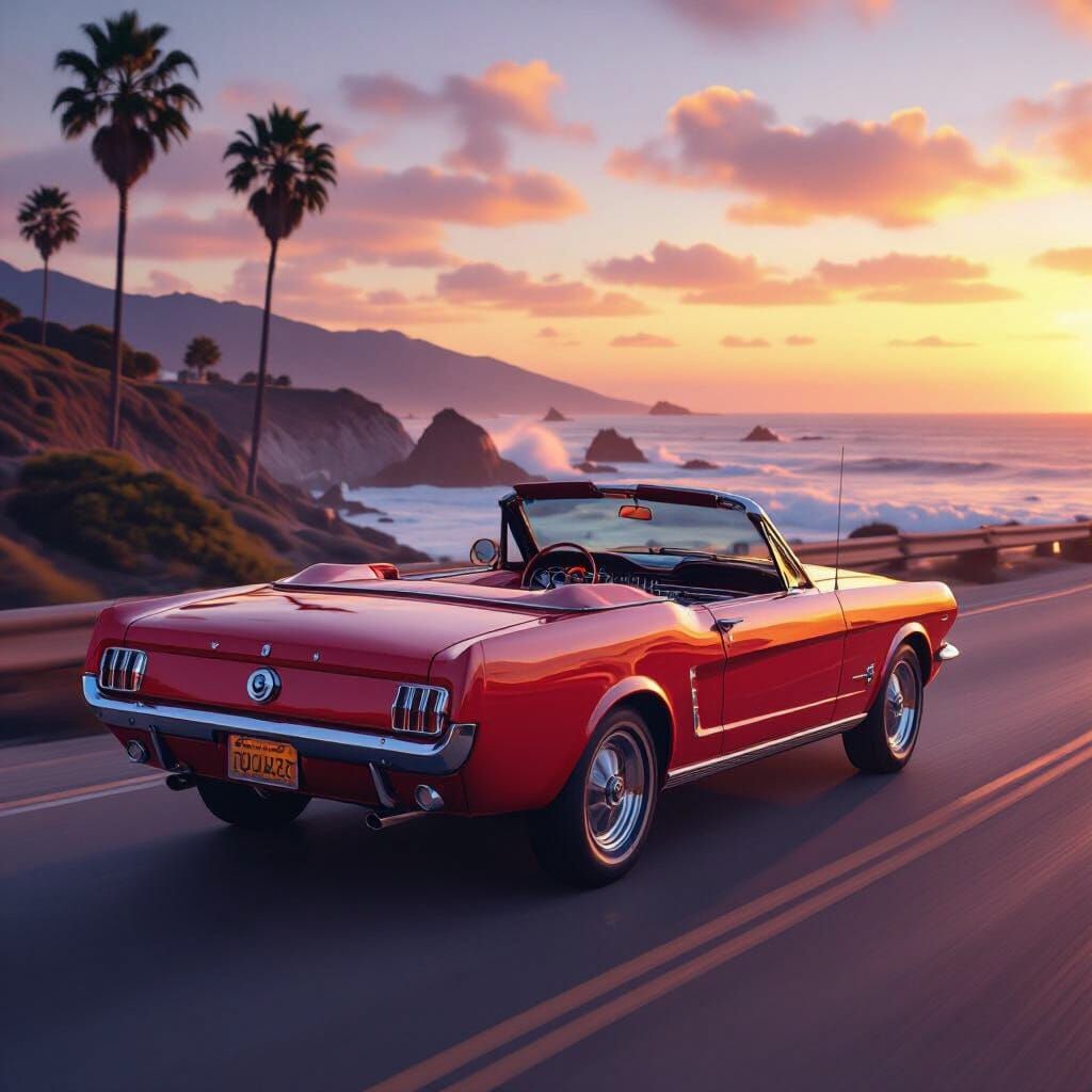 A photorealistic image of a cherry red 1965 Mustang convertible driving along the Pacific Coast Highway. The sunset reflects off the car's chrome, with palm trees and waves visible in a retro cinematic style.