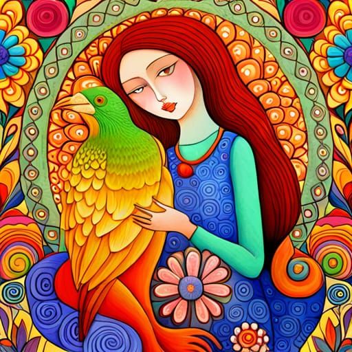 A vibrant image of a girl surrounded by birds and flowers, evoking a fairytale atmosphere. The artwork showcases magic realism with rich colors and intricate details.