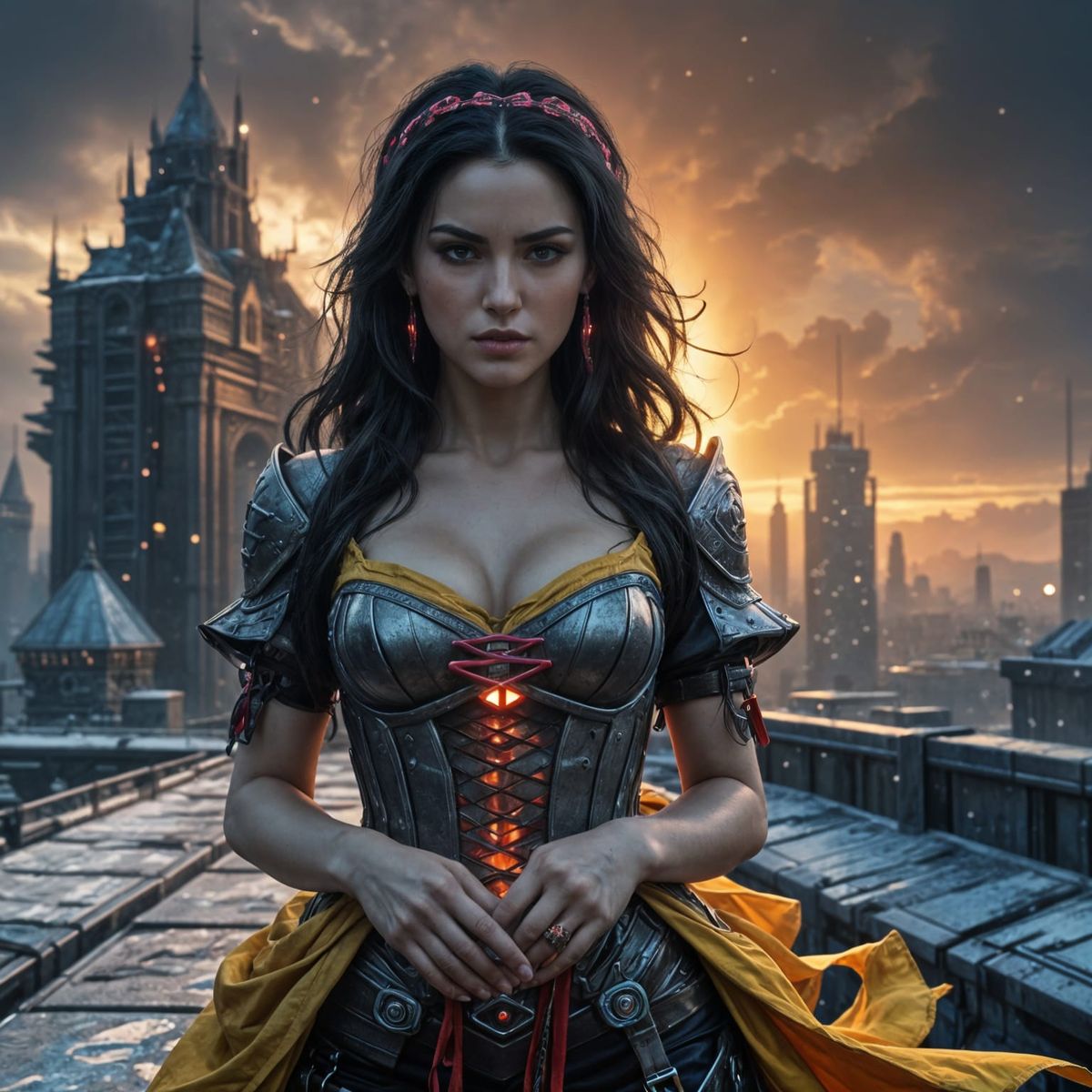This image showcases a futuristic take on a classic fairy tale character, blending traditional and cyberpunk elements in a stunningly realistic dark neon cityscape. The subject, a beautiful woman with long black hair, wears a unique mix of armor and jewelry that shines with neon lights, set against a bac...
