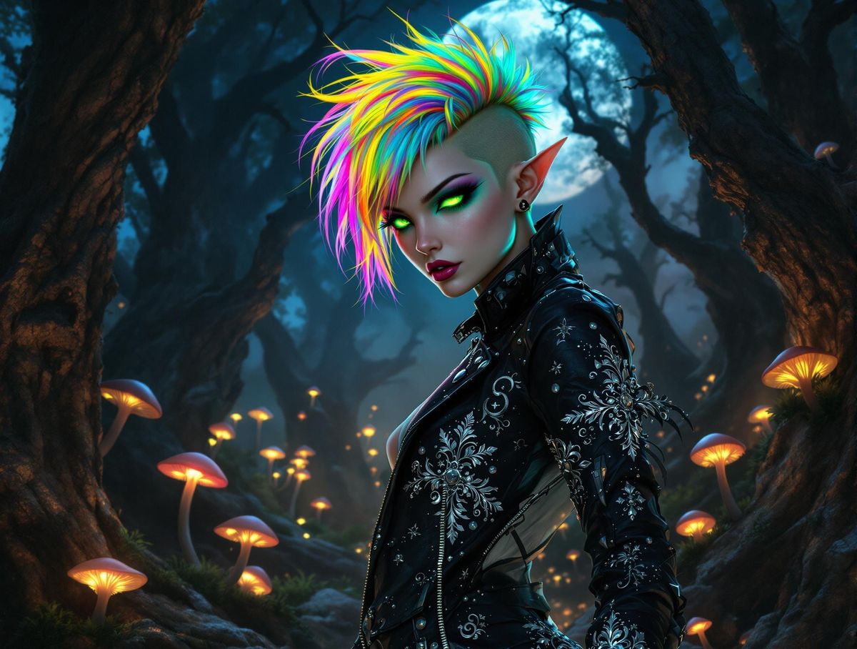 A vivid image of a cyberpunk fairy in a moonlit forest. The fairy has rainbow hair, green eyes and wears a leather jacket. The scene is rendered with dramatic lighting in a dark fantasy aesthetic.