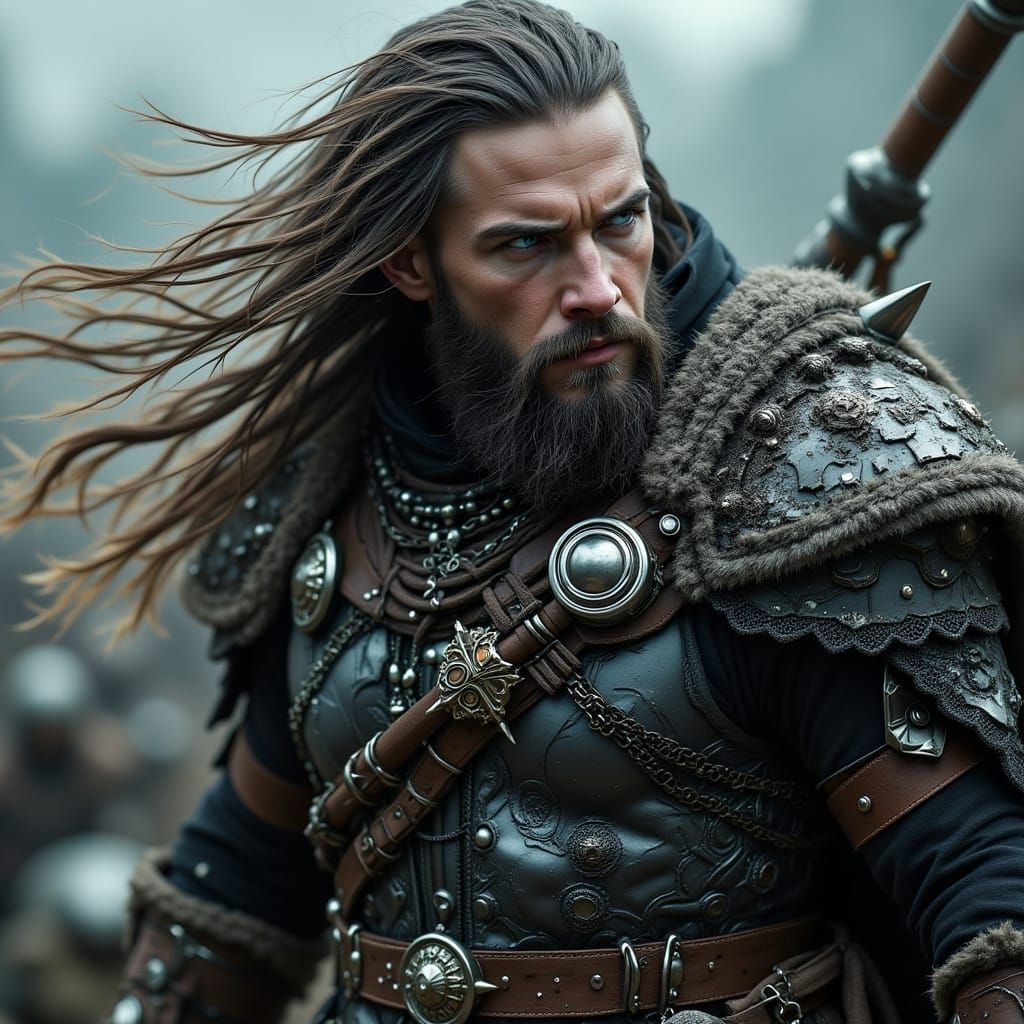 This image shows a formidable Viking warrior, complete with long hair, a beard, and full battle armor. The figure embodies strength and readiness for combat.
