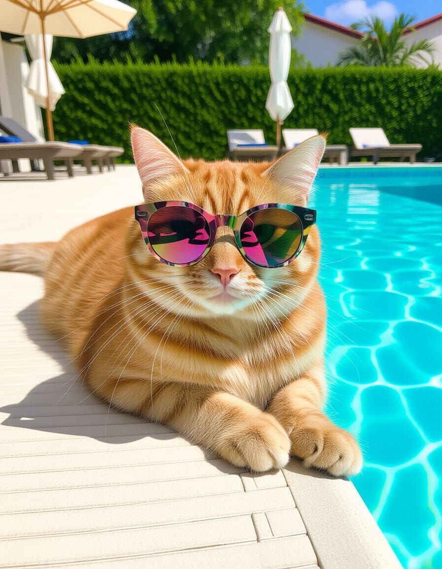 This image features a charming cat with vibrant red fur relaxing by a swimming pool, sporting stylish mirrored sunglasses. A perfect summer scene.