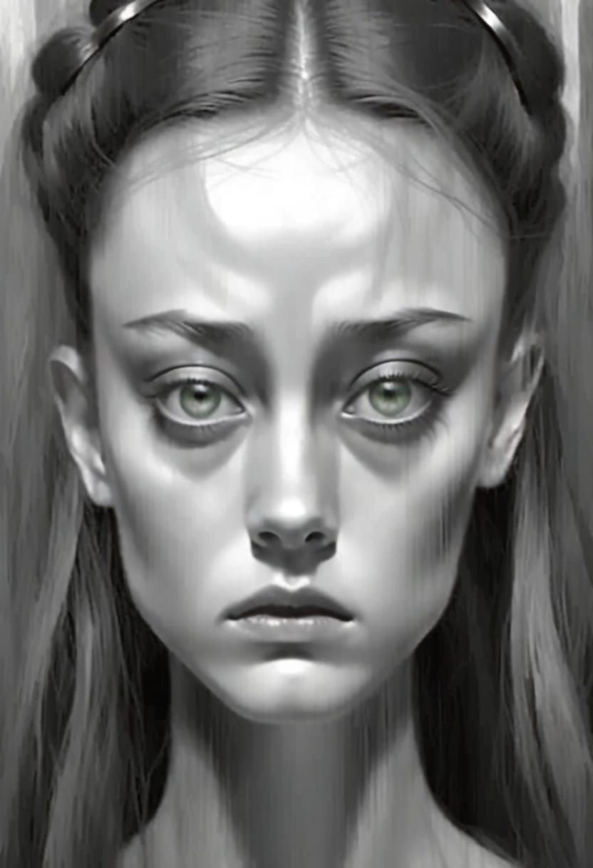This image shows a sorrowful woman with flowing hair and striking green eyes. The portrait evokes the style of early 20th-century Art Nouveau.