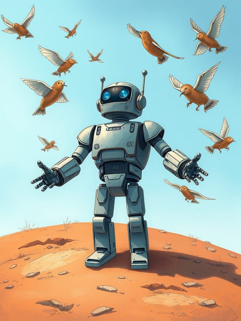 This serene image depicts a copper robot standing on a rocky outcropping, surrounded by a group of ravens soaring in the bright blue sky. The robot's outstretched arms convey a sense of wonder, while the ravens' dynamic flight creates a sense of movement. The scene is rendered in a realistic yet whimsica...