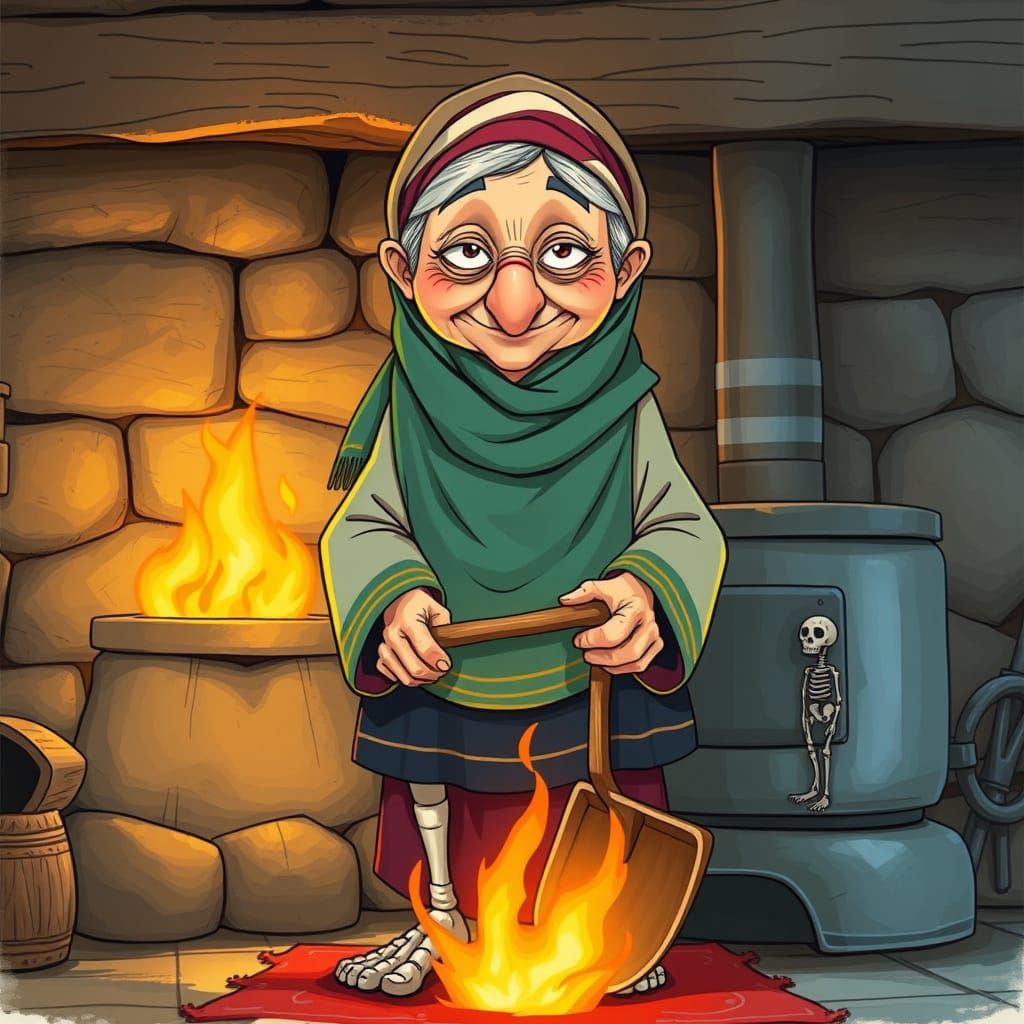 This image shows an elderly woman in traditional Russian clothing with one skeletal leg, standing by a rustic stove. The anime-style artwork is highly detailed and vibrant.
