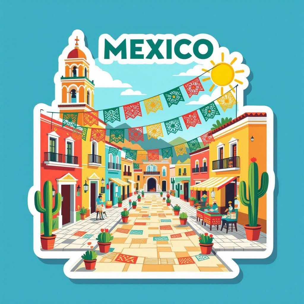 This image showcases a lively travel sticker of Mexico, featuring colorful traditional architecture, fluttering papel picado, and a sunny plaza. The design uses vivid warm colors for a cheerful atmosphere in a vector style.