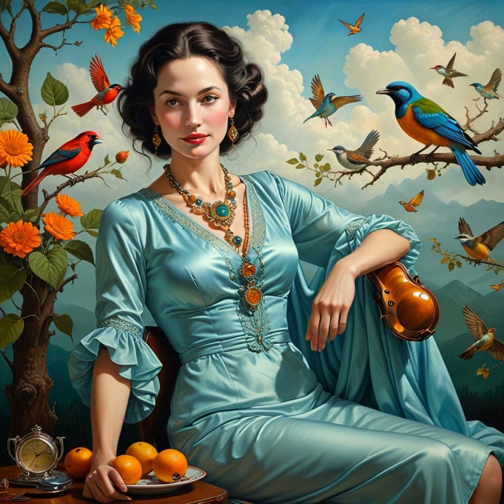 beautiful happy 48-year-old lady by Karol Bak, Amanda Clark, Andrey Bobir, Emily Balivet, Esao Andrews, Dorothea Tanning, Fabio Hurtado, Georgia O’Keeffe, Igor Morski, Kuzma Petrov-Vodkin, Marc Jacobs, Michael Cheval, Sean Archer, vivid colors, sharp focus, great focal depth, high definition, ultra quality ...