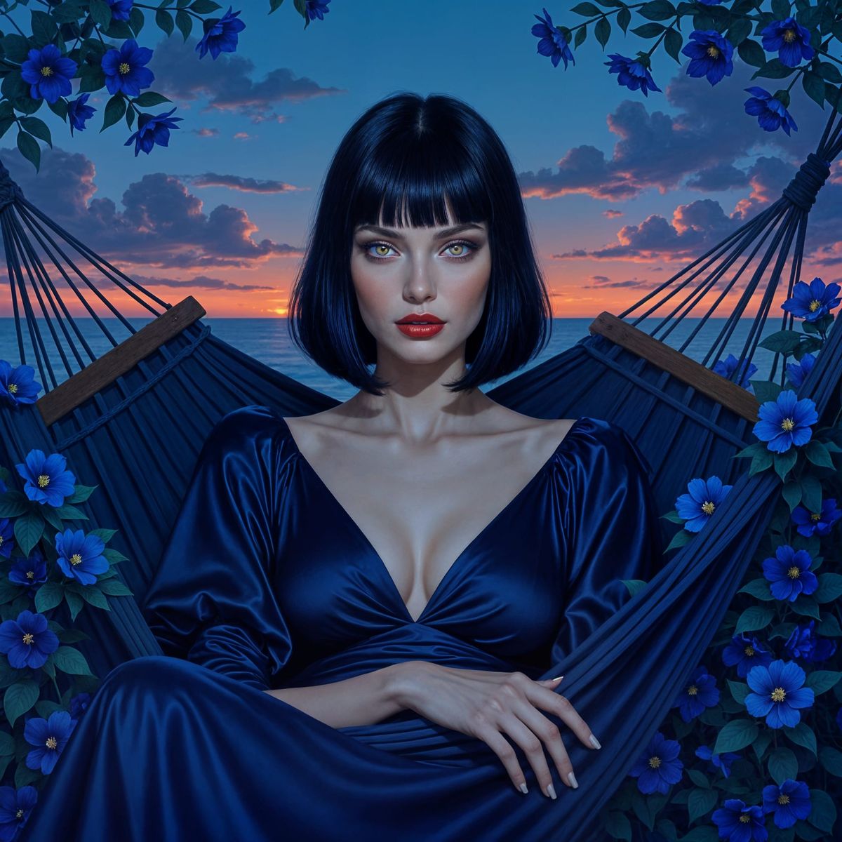 This image shows a mysterious woman with pale skin and golden eyes, resting in a hammock with indigo flowers. The art features bold contours and vibrant highlights, with dramatic lighting.