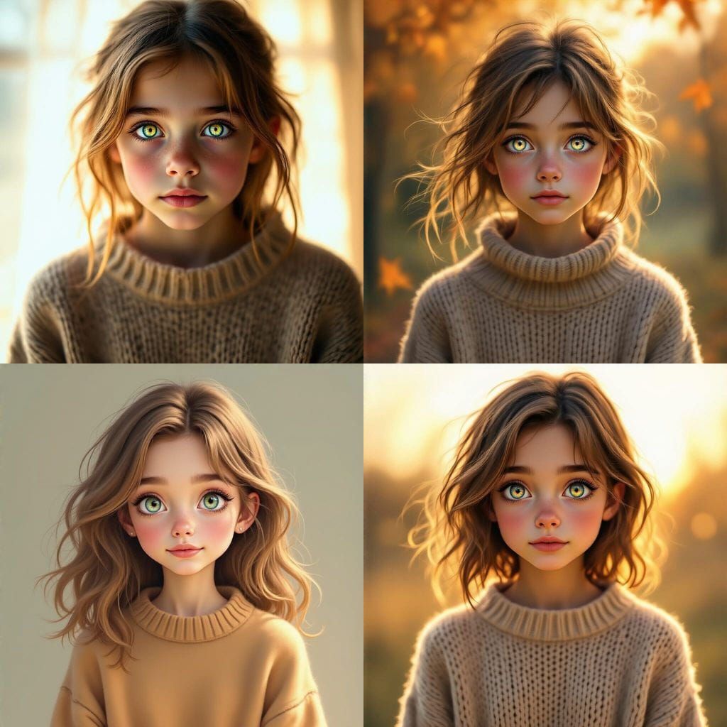 This image features a young girl with light brown hair and uniquely colored eyes, dressed in a cozy, oversized sweater. A portrait capturing youthful innocence.
