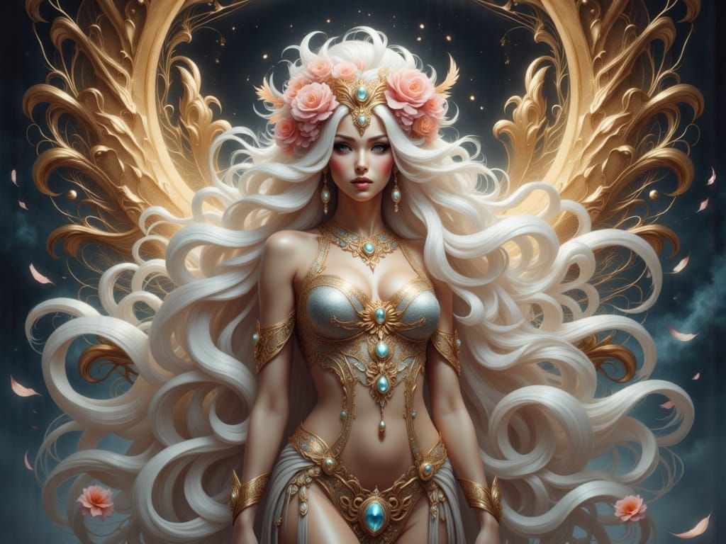 A majestic Elvish woman with flowing white hair and a diamond outfit. Features intricate Art Deco details, fractal patterns, and wave function aesthetics in a stunning 32k abstract vector style.