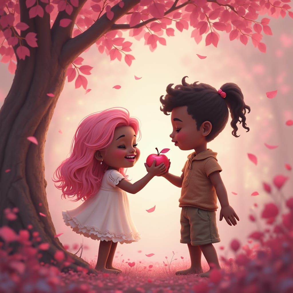 A whimsical scene of a woman with pink hair playfully feeding an apple to a man in a magical garden. Soft, ethereal lighting and gentle fantasy elements create a dreamy atmosphere.