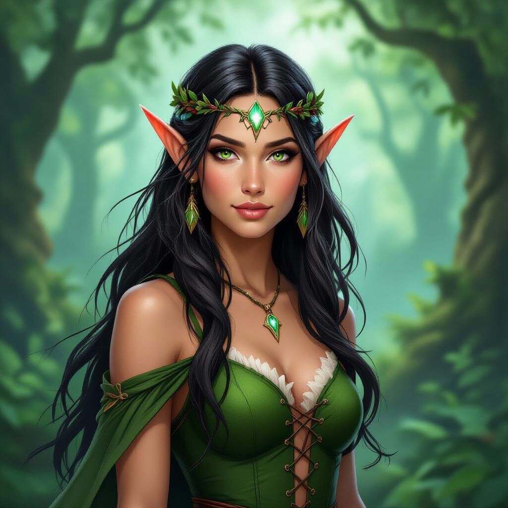 This image depicts a dark-haired wood elf in a green dress, adorned with an elemental headband, standing serenely within a magical forest. The artwork evokes fantasy and enchantment.