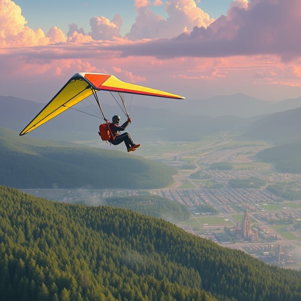 I am flying high above the forest in a self-glider and looking down on at the city scape below