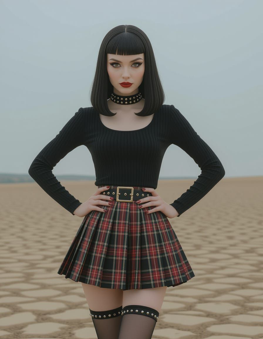 A hauntingly beautiful woman with large eyes poses against a desolate background. The image has a dark fantasy aesthetic with surreal and sensual elements, rendered with rich colors and ultrafine detail.