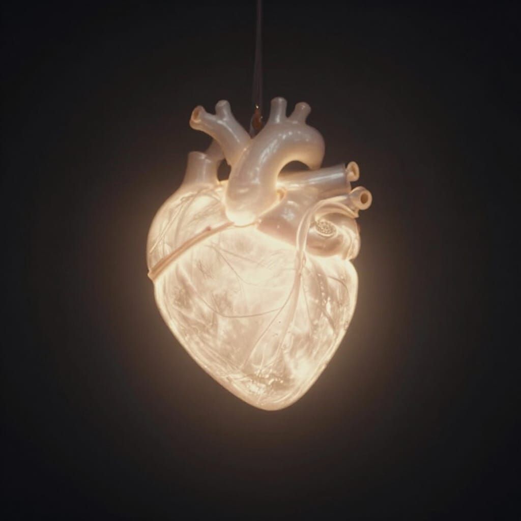 This image shows a hyper-realistic, glowing heart symbol radiating a sense of calm and reassurance. Light emanates gently outward, creating an ethereal glow with soft volumetric lighting.
