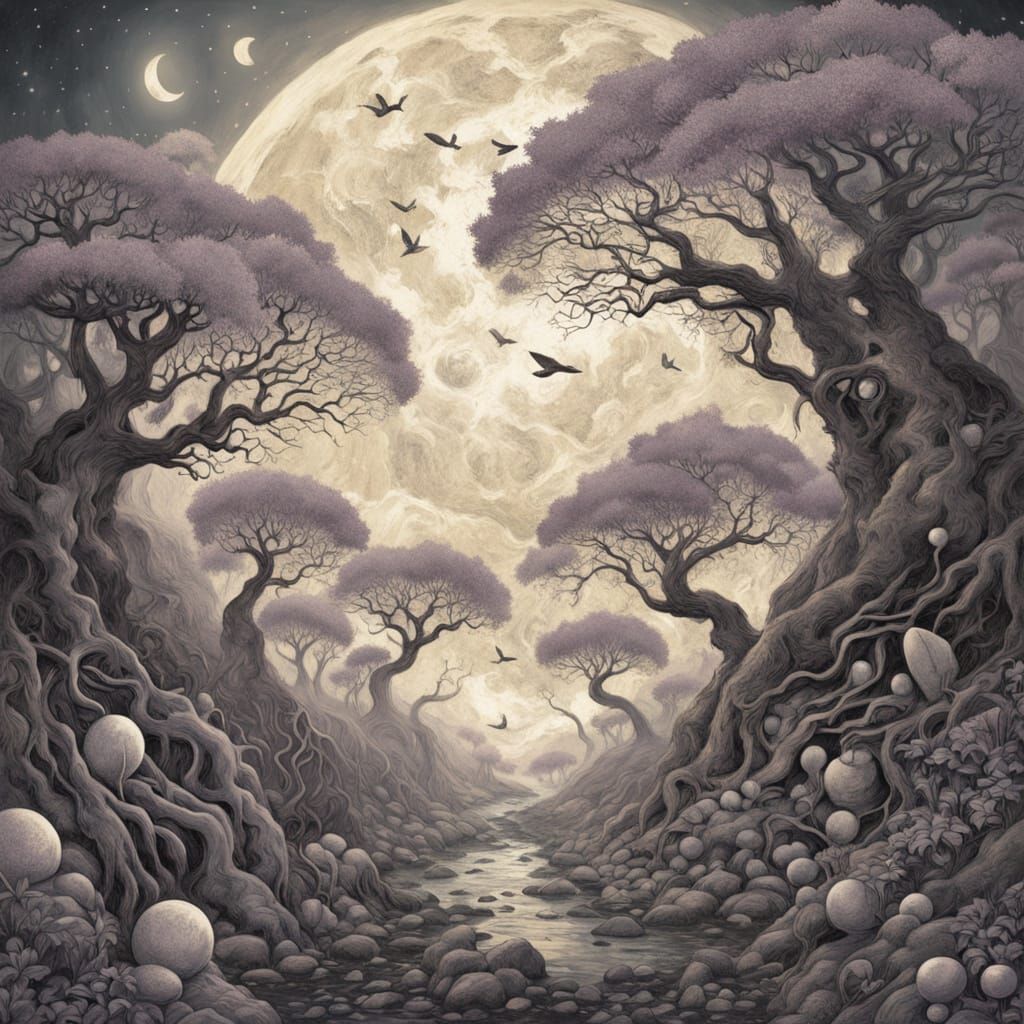 This image depicts two goddesses in a cosmic drama, one dark with stardust hair, the other embodying the living world, their bodies bioluminescent. It features intricate details, cosmic surrealism, and symbolic elements.
