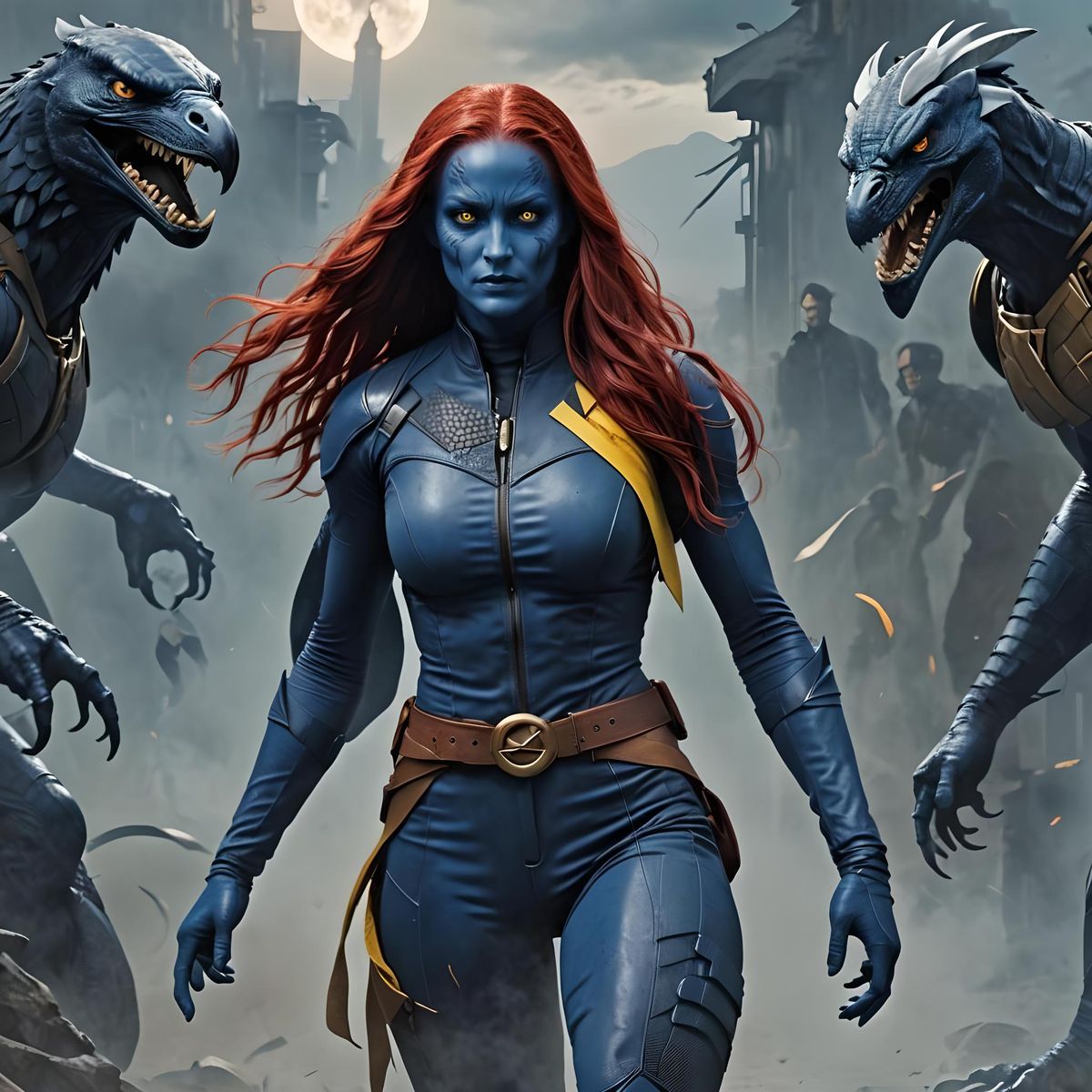 This image depicts the X-Men character Mystique, a blue-skinned mutant. She has yellow eyes and red hair, and is posed in front of a futuristic X-Men ship under a full moon.