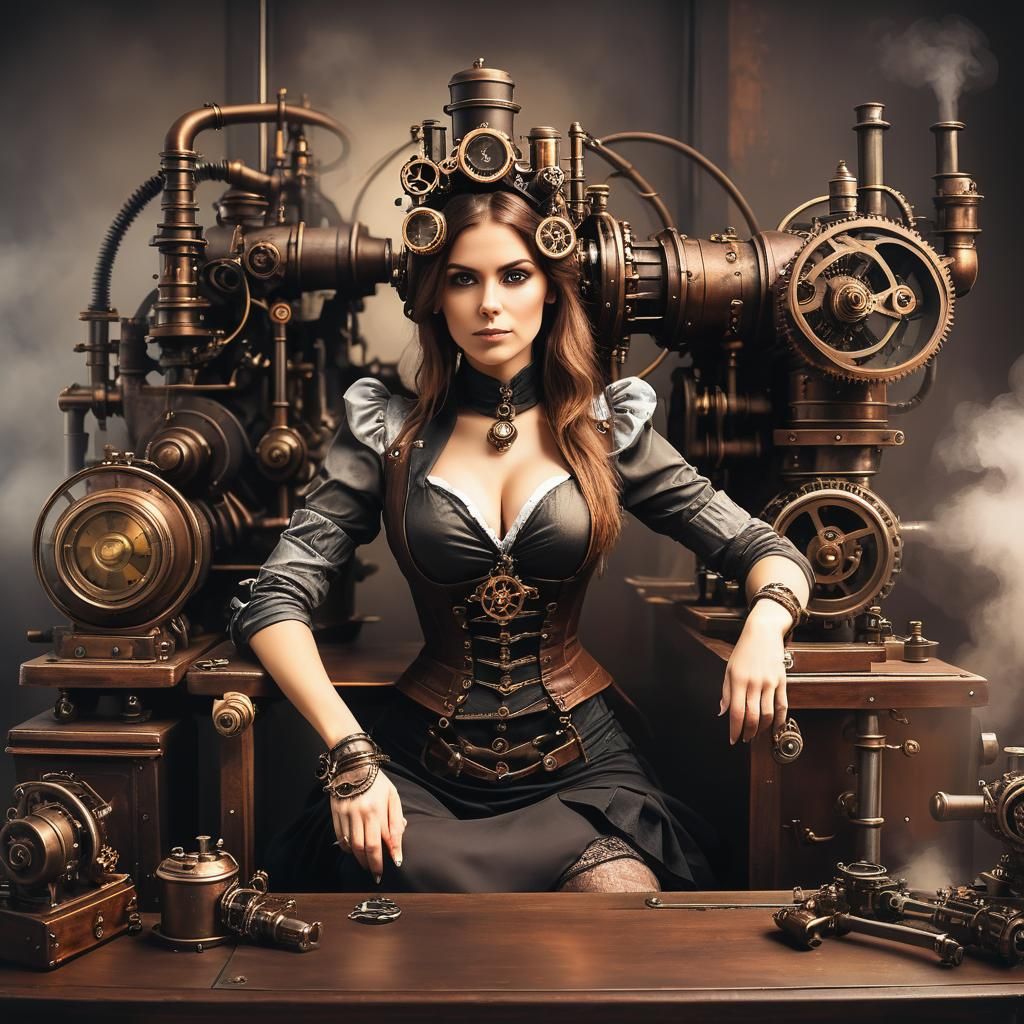 This image shows a woman seated at a desk, with a steampunk engine incorporated into the scene. The artwork blends Victorian aesthetics with industrial elements.