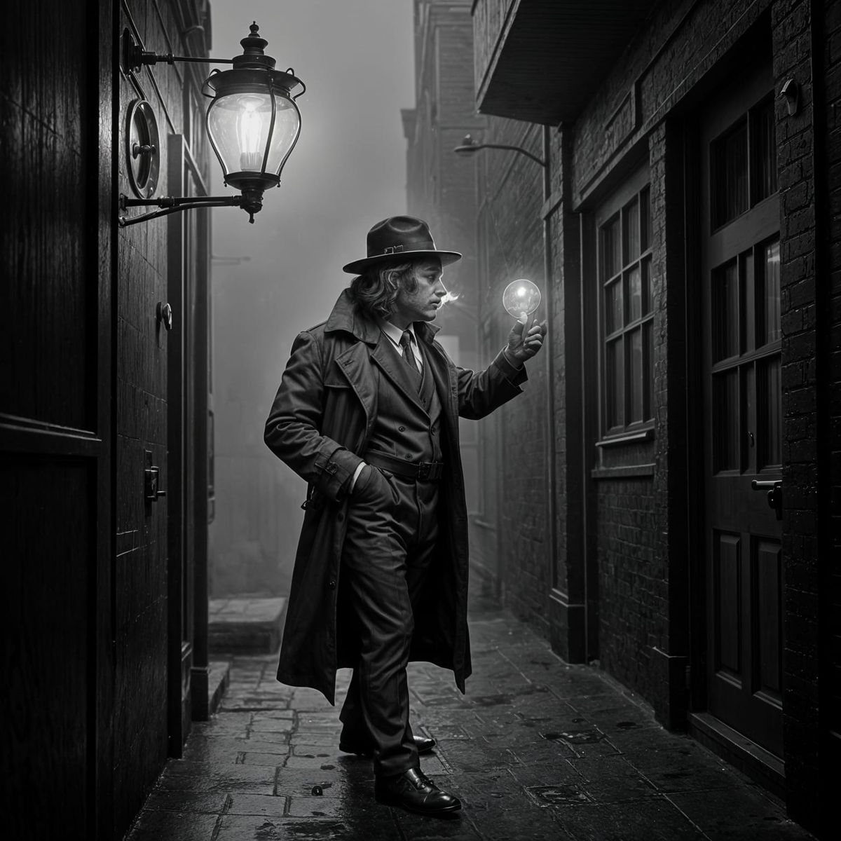 This image depicts a 1940s anthropomorphic cat detective in a trench coat and fedora, standing in a rain-slicked alley. The scene features a neon sign, dramatic shadows, and a glowing orb, rendered in a classic film noir style with surreal distortions.