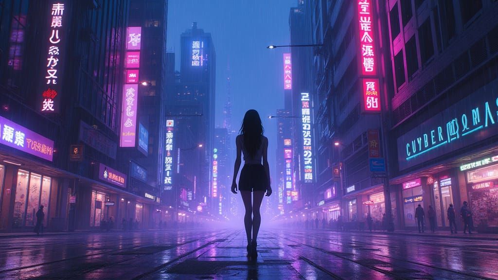 A digital rendering of a cyberpunk cityscape at night, featuring sleek skyscrapers and bustling streets. A solitary woman walks amidst the neon-lit urban landscape in a gritty, cinematic style.