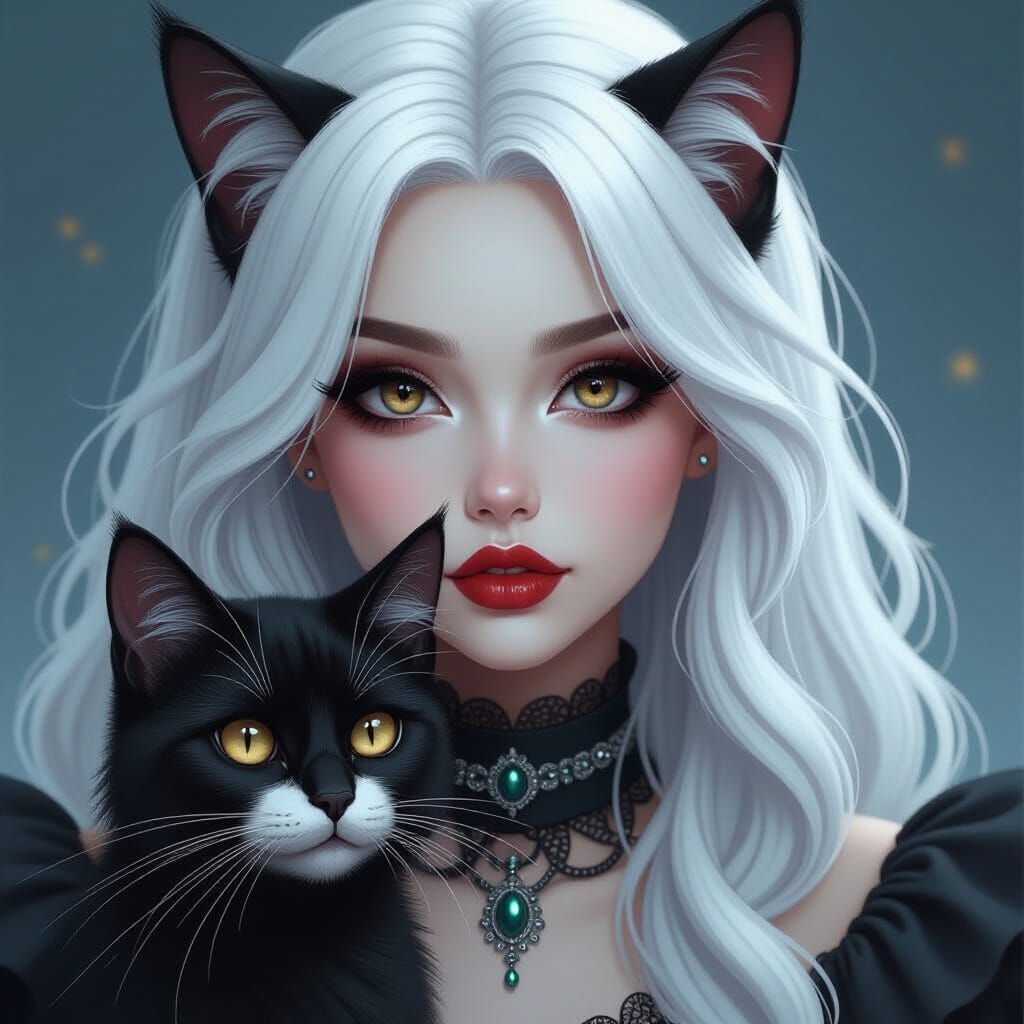 This image depicts a gothic alien woman with feline features, including large brown eyes and white hair. The artwork has a surreal and otherworldly aesthetic.