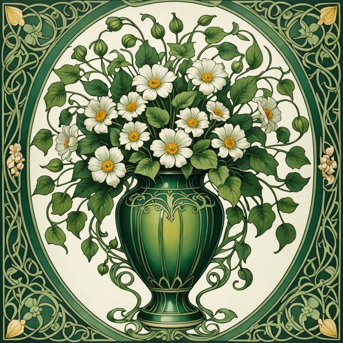 This image showcases a beautiful vase filled with flowers and green vines, rendered in the elegant Art Nouveau style with a predominant green color palette.