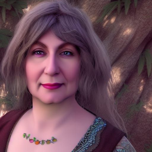This image shows a middle-aged, chubby woman who is a musician and yogini, surrounded by fairies and tarot cards. The image has a photorealistic fantasy aesthetic.