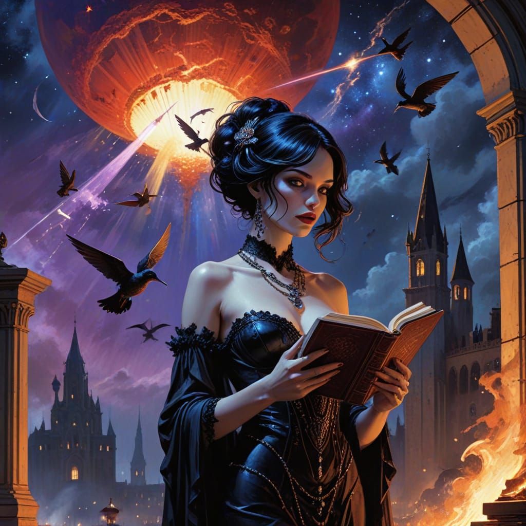 This image shows a witch in flapper attire amidst a surreal dreamscape. The scene includes spectral brains, monstrous hummingbirds, Lovecraftian entities, and arcane energy, set against a nightmarish backdrop with gothic and surreal elements.