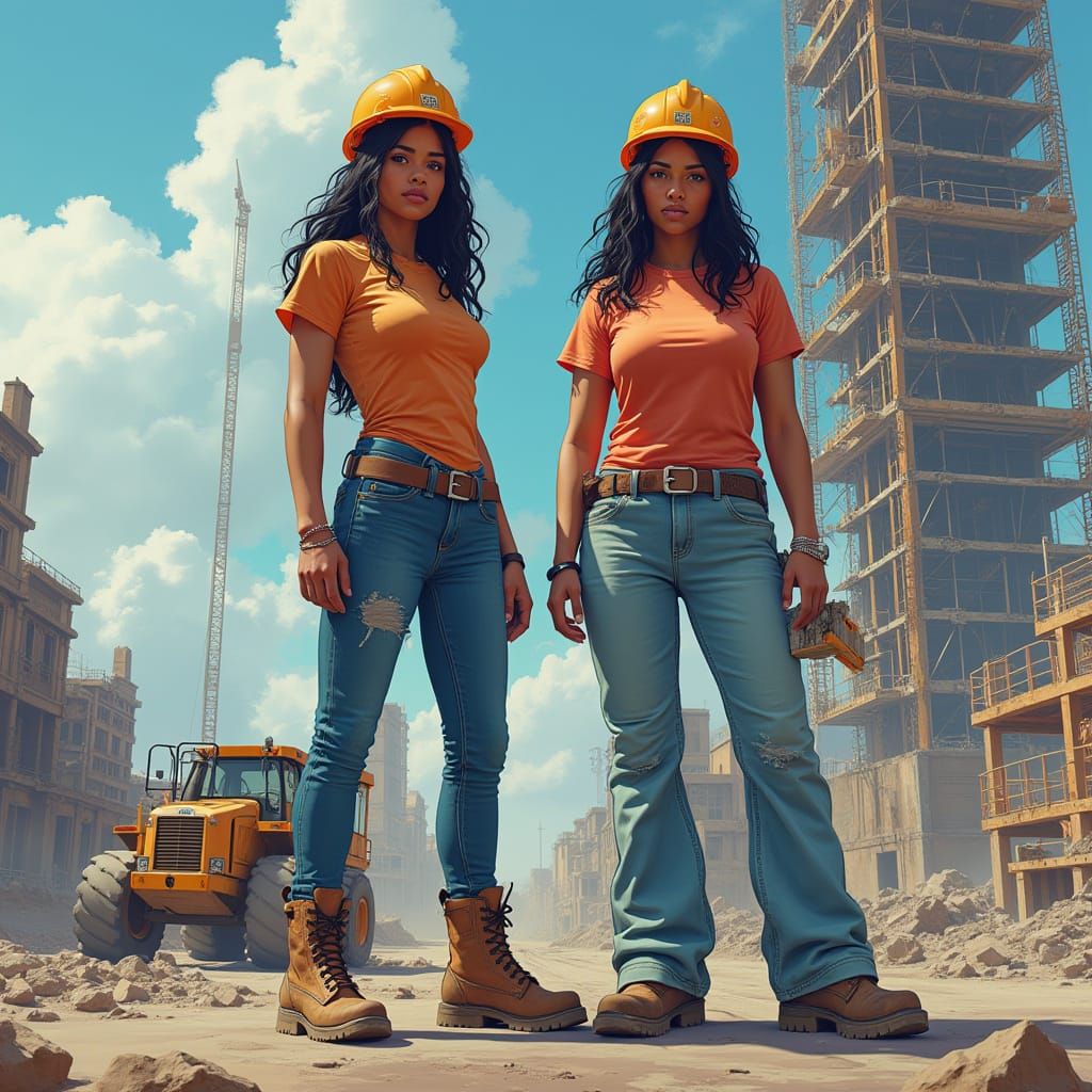 This image shows two Native American women, around 35, on a construction site. Clad in work clothes and hard hats, they stand before a partially constructed skyscraper in a hyperrealistic digital art style.