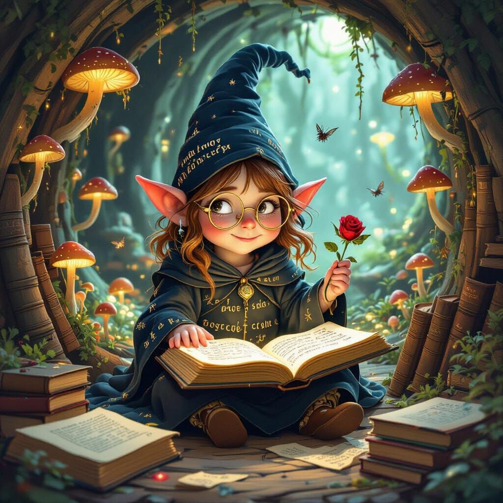 This image shows a forest gnome dressed as Belle surrounded by enchanted books and mushrooms. The softly glowing image is reminiscent of mystical realism with futuristic detailing and whimsical character design.