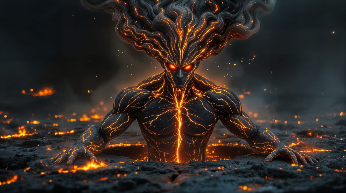 This image depicts a humanoid figure rising from molten lava, with glowing fissures and burning red eyes, set against a dark and atmospheric volcanic backdrop, showcasing a unique blend of heat and controlled power.