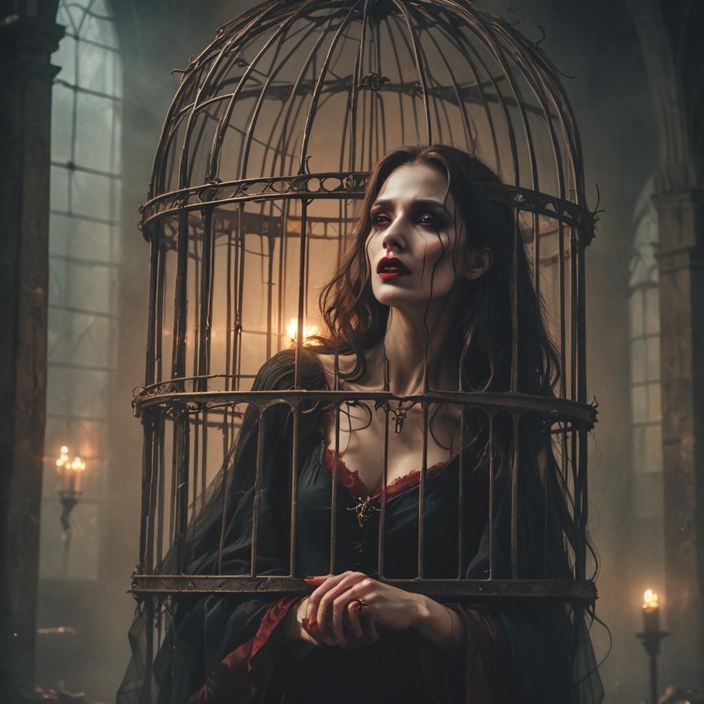 This image shows a vampire trapped in a mystical cage within an old church. Fog hangs around the vampire's helpless victim in the cool twilight, depicted with Caravaggisti-style chiaroscuro.