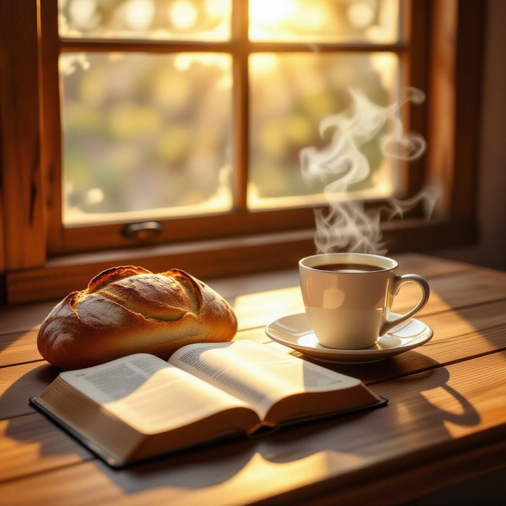 This digital painting depicts a warm, peaceful scene of a wooden table with bread, coffee, and an open Bible, illuminated by soft morning sunlight. Features vibrant colors and a semi-cartoon style.