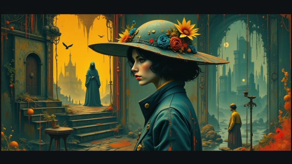 A hyperdetailed portrait of Mangoria and alien beings from the twilight zone, rendered with dynamic lighting and volumetric effects in a deco surreal aesthetic.