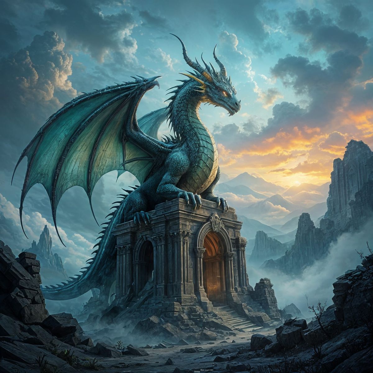 A majestic dark fantasy dragon perched atop a crumbling ancient ruin, its scales shimmering with an ethereal glow. The setting is a desolate, mist-shrouded landscape under a sky filled with swirling nebulae. Gold , green, teal and black colors