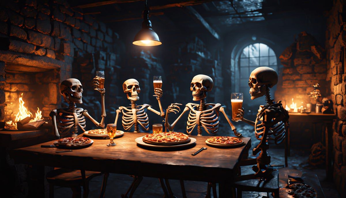 This hyperrealistic image depicts a vibrant skeleton birthday party in a dungeon, complete with friends, pizza, and drinks. Features dramatic lighting and detailed atmosphere.