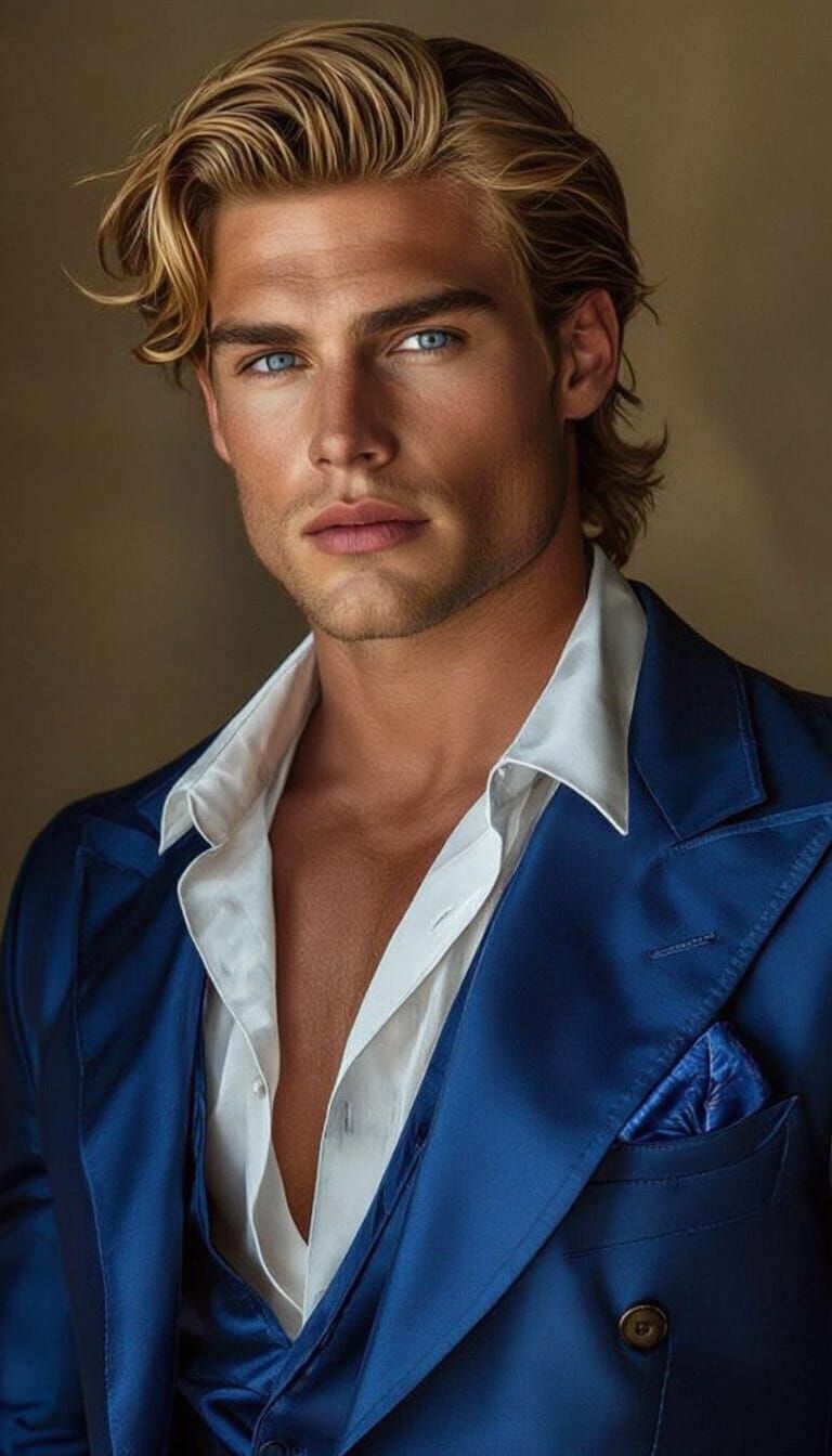 This image showcases a classically handsome 28-year-old man wearing a striking blue silk suit and an open white dress shirt. The portrait emphasizes his refined features.