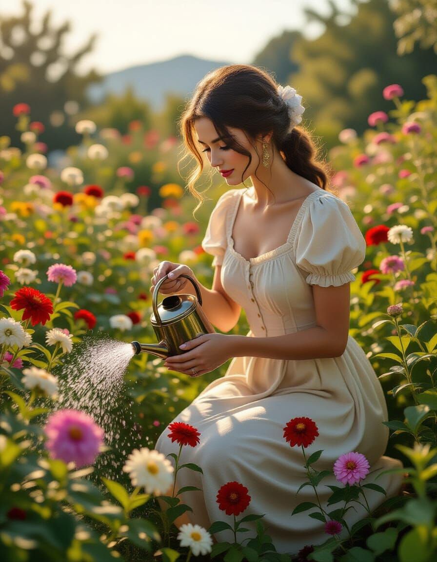 This image shows a beautiful woman tending to her flowers in an expansive garden during the bright midday sun. The scene is captured with ultra-realistic detail, resembling a digital matte painting.