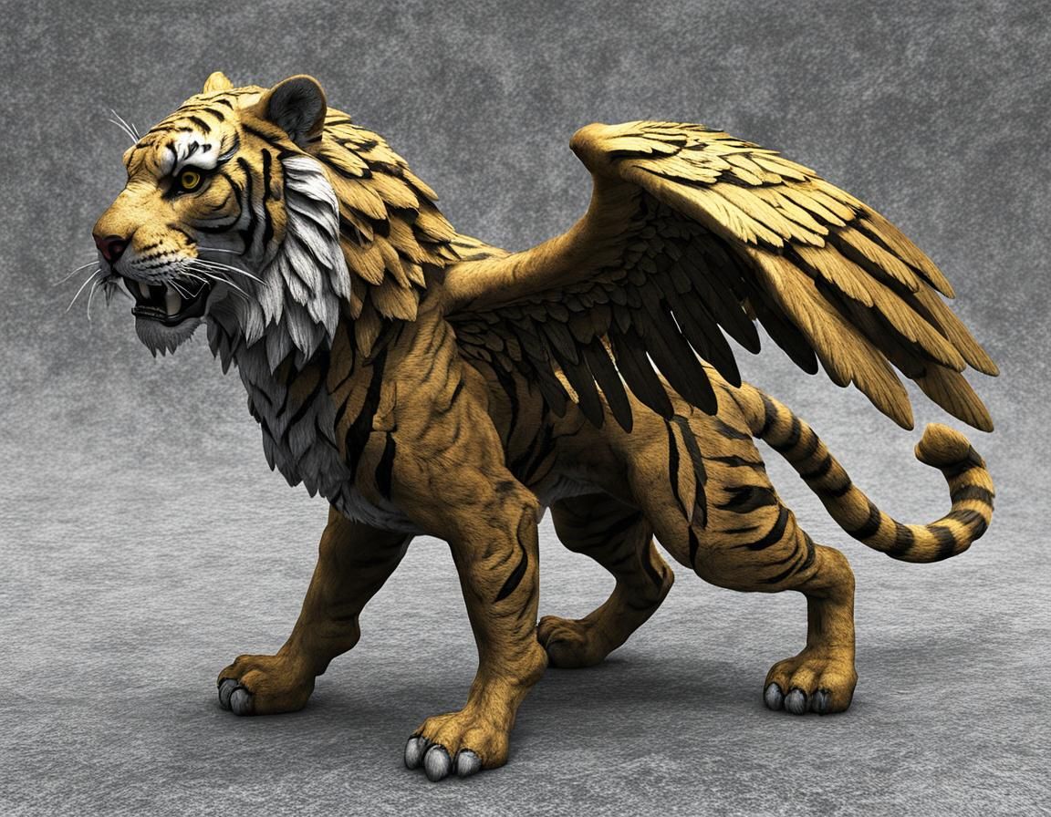 This image shows a mythical gryphon-like creature, combining the features of a winged tiger. The beast displays a majestic and formidable presence.