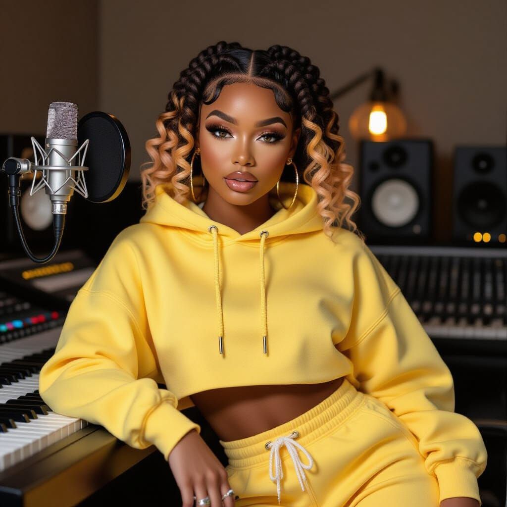 Ultra-realistic portrait of a glamorous Black R&B artist with expressive eyes, wearing a pastel yellow outfit. Dramatic lighting creates a cinematic feel for this high-fashion image.