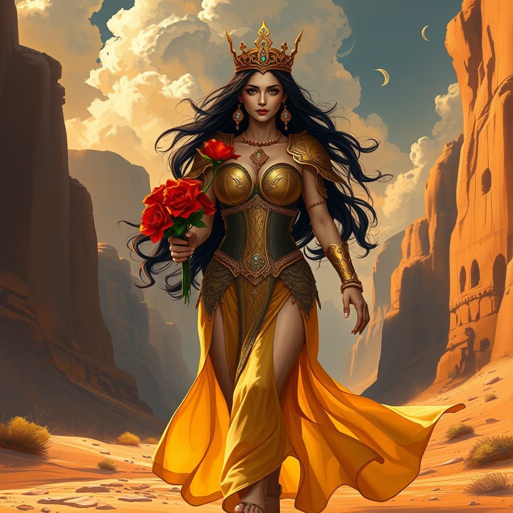 This image shows a powerful, high-fantasy queen confidently walking through a desert canyon, wearing intricate golden armor and carrying a bouquet of red flowers. The scene is bathed in warm, cinematic light, with a focus on golden tones and regal elegance.