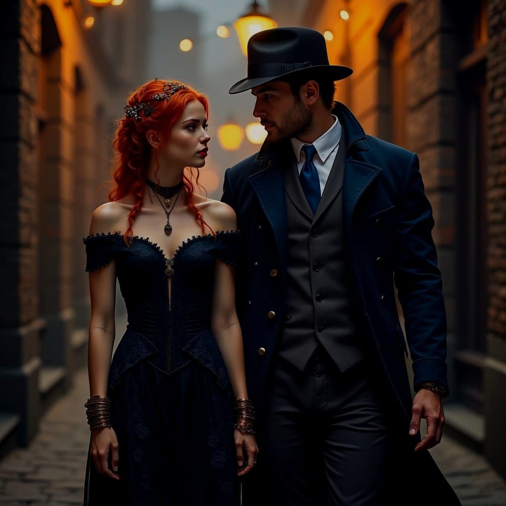 This image captures a young woman alchemist strolling through a steampunk city alley, adorned with beads and trinkets in her hair. She's accompanied by a rugged detective in 1930's attire, set against a cinematic backdrop of nighttime splendor.