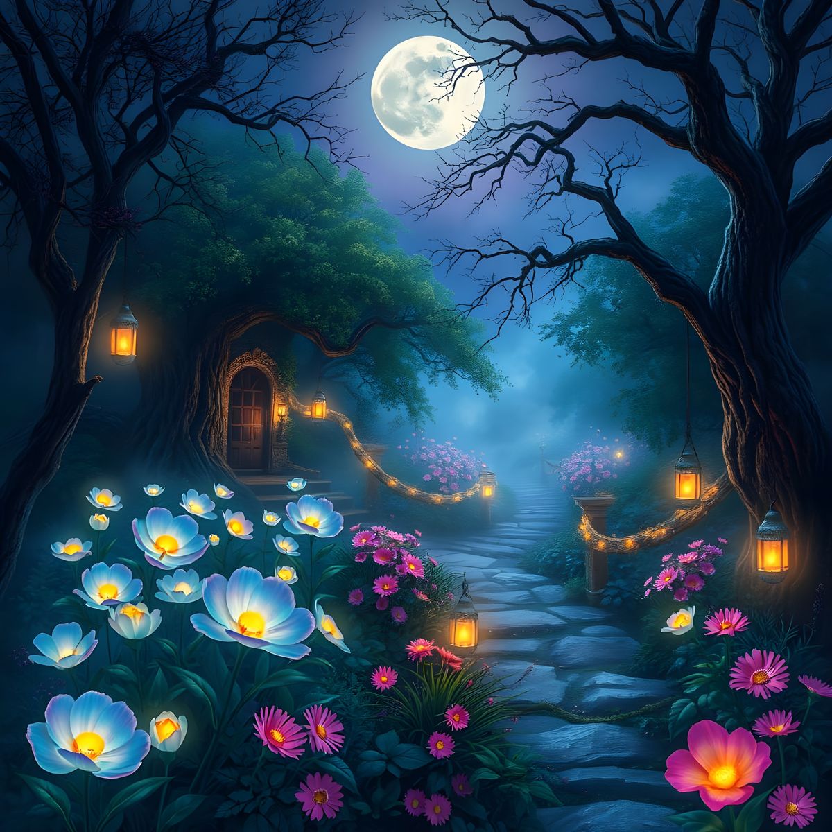 This image shows a mystical garden of glowing flowers that only bloom under the cover of darkness, evoking a sense of enchantment and fantasy in a detailed, dreamlike atmosphere reminiscent of traditional European art
