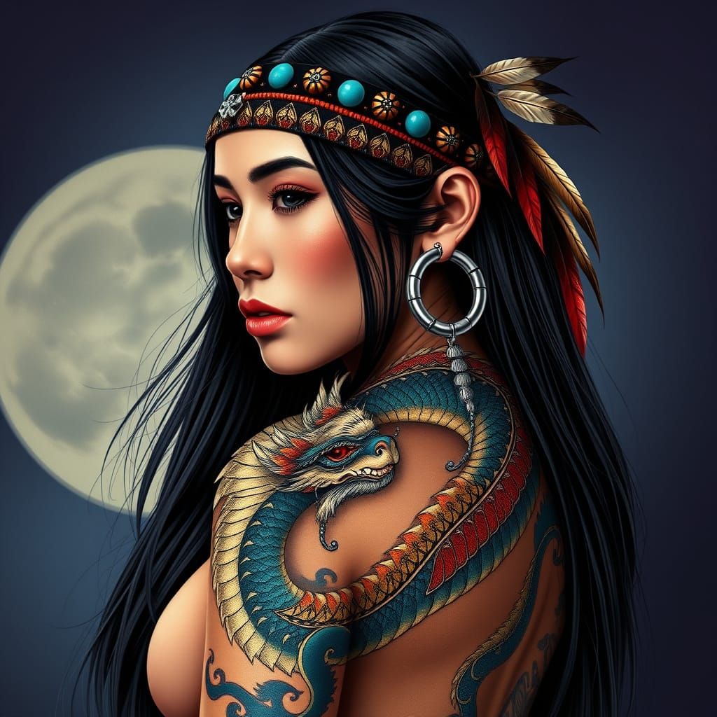 This striking image shows a Native American girl with a mesmerizing full-body tattoo, blending traditional and Japanese art, featuring an eastern dragon and bold colors, with a gritty texture and modern flair.