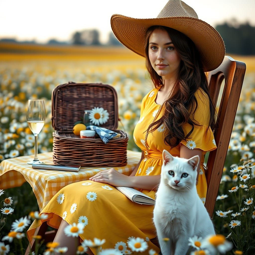 "A realistic photograph of a young woman with long brown hair and soft facial features, wearing a wide-brimmed cowboy hat and a yellow dress with white daisy prints, sitting gracefully on a wooden chair beside a small table covered with a yellow checkered tablecloth in the middle of a daisy field. On the table: a wicker picnic basket, a wine glass, a closed book with a daisy on top, a neatly folded blue plaid napkin, and two lemons. A white cat with blue eyes stands near her feet, ..."