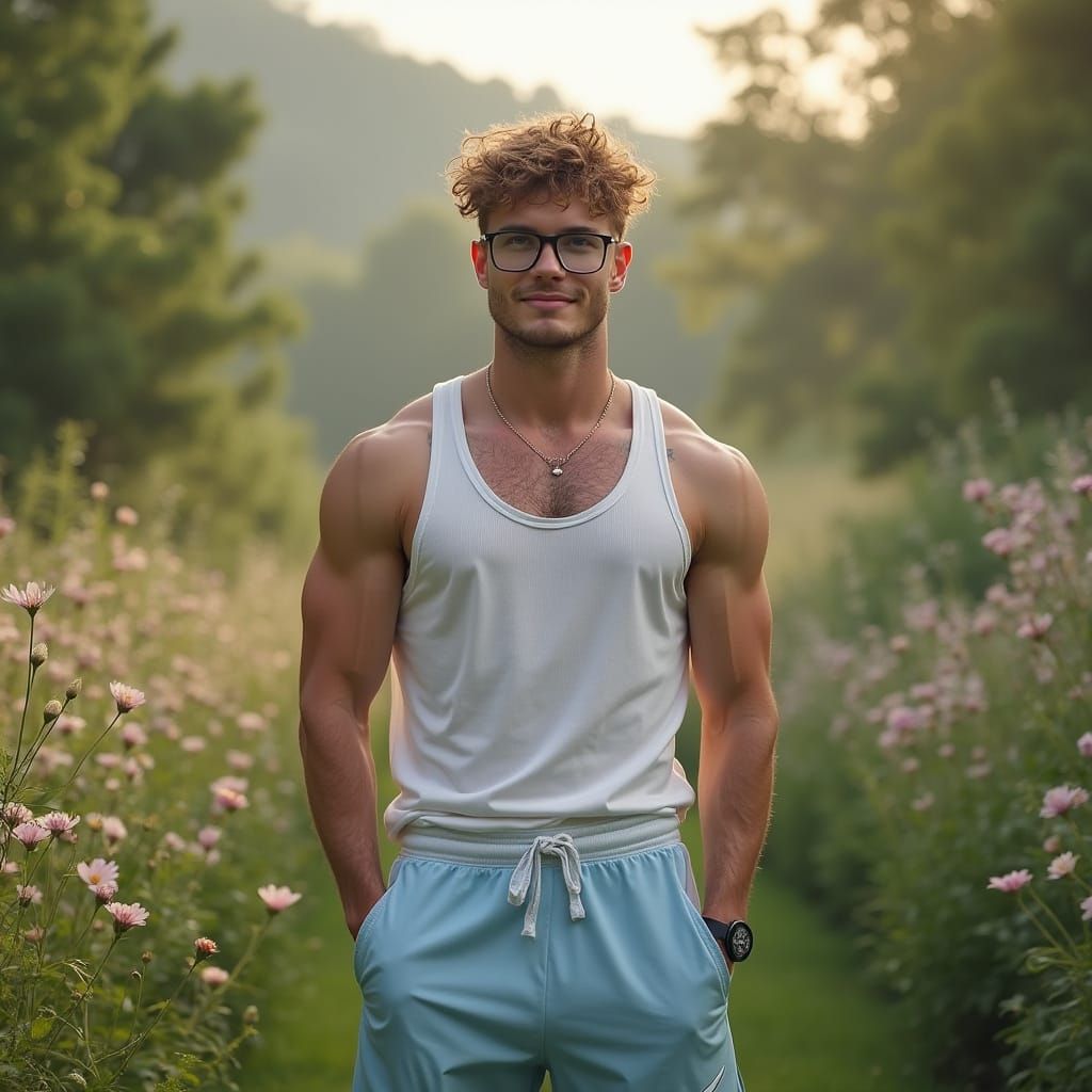 A striking picture of a tall, muscular man in a romantic countryside garden. The photorealistic image captures the serene mood and natural light, with the subject wearing casual athletic attire and a gold necklace.
