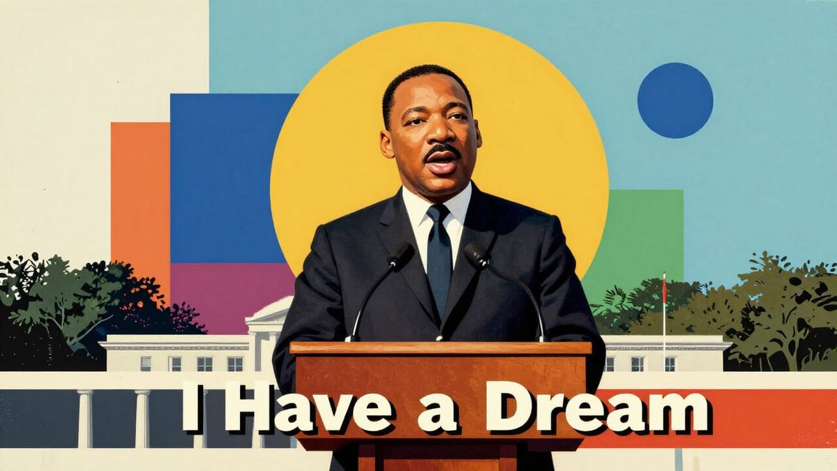 This image depicts Martin Luther King Jr. delivering his historic speech, presented in a surrealist pop art style with geometric Bauhaus influences and vibrant triadic colors.