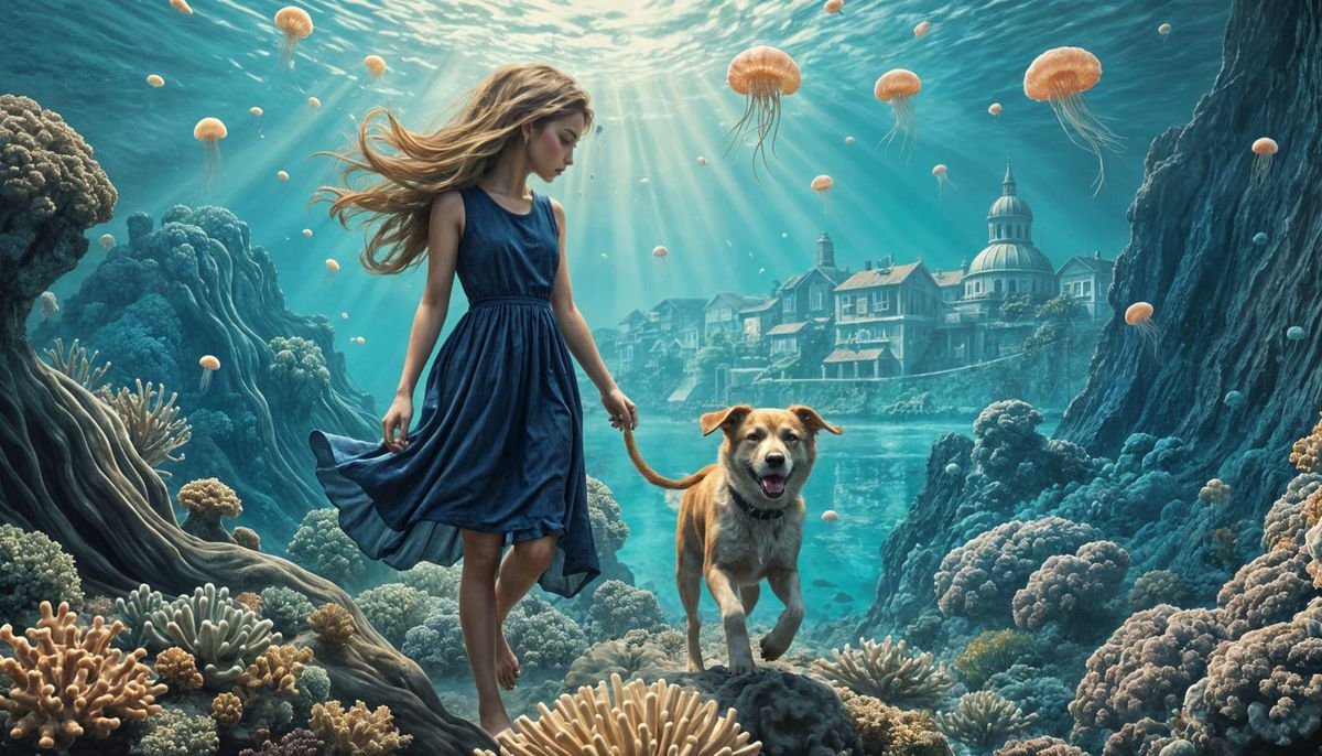This image shows a girl walking her dog in an underwater scene. A vibrant coral reef, jellyfish, and an underwater town create a detailed and colorful oil painting style.