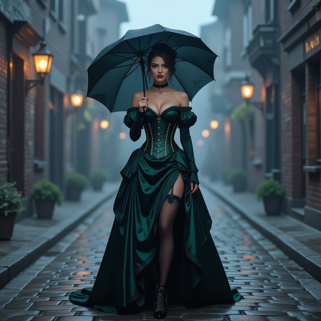 This image shows a woman in a dark green gown and leather corset, holding a black parasol on a foggy cobblestone street with lanterns. The aesthetic is photorealistic with intricate textures.