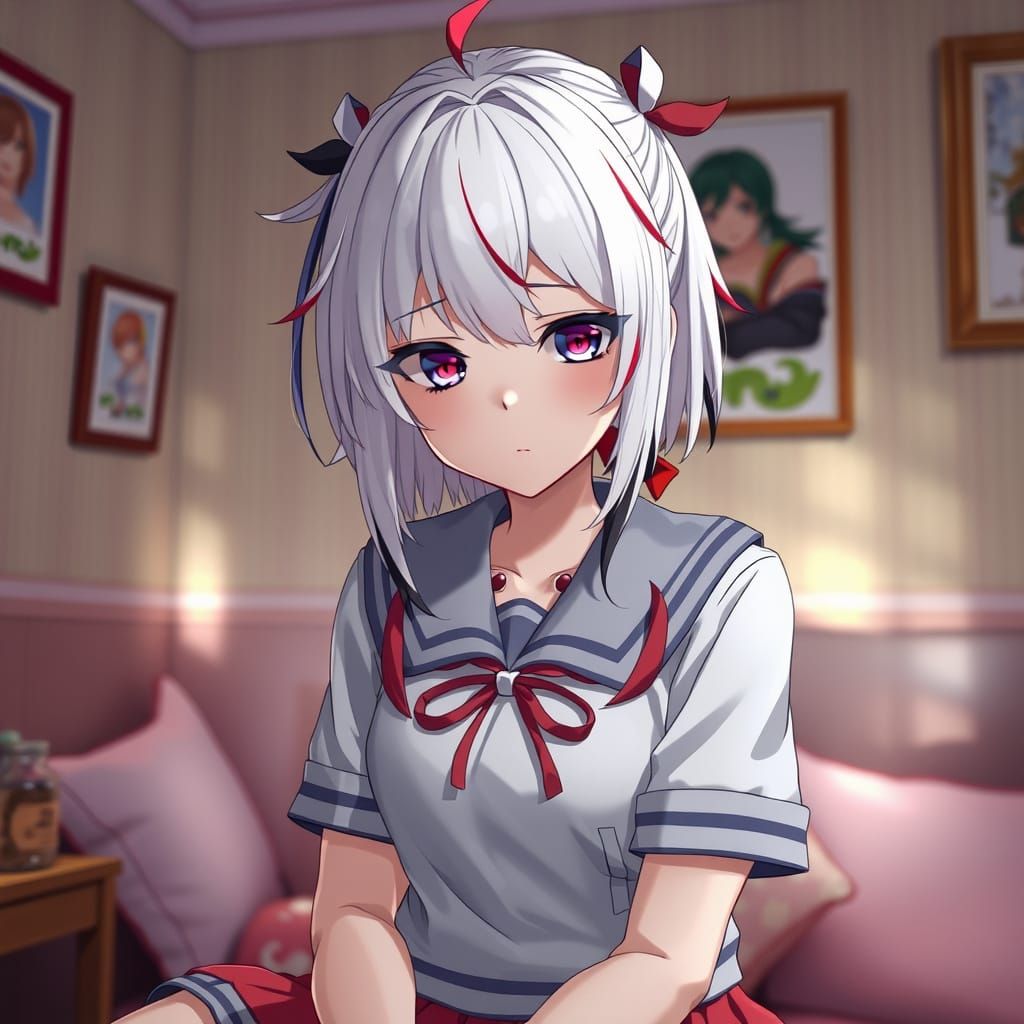 This image shows a young schoolgirl with striking white hair and vibrant red streaks, wearing a detailed anime-style uniform, in a cozy pastel-colored room, as she looks annoyed at her friend, created in 3D anime art style with ultrafine details and breathtaking textures